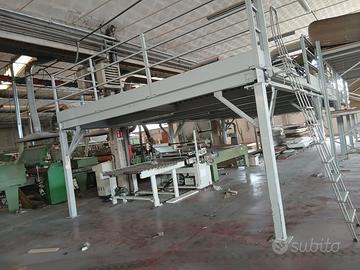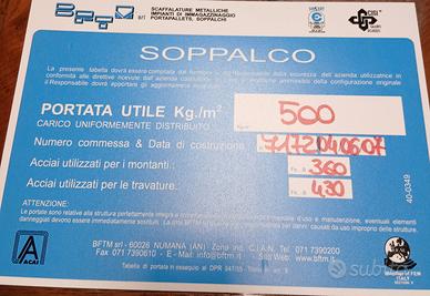 Soppalco industriale in metallo comprensivo di balaustre e con pianale zigrinato. Buone le condizioni. Dimensioni: -larghezza mt.5 -lunghezza mt.17 -altezza sotto trave mt.2,15 -portata kg.500/mq N.B.In aggiunta (o separatamente) è possibile acquistare anche la scaffalatura metallica delle dimensioni di mt.12,60xmt 1,5x h 3,5 al valore di € 1.500,00 I prezzi si intendono esclusi di smontaggio e trasporto, che rimarranno a cura e spese dell'acquirente
