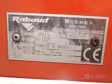 Spaccalegna carrellato usato marca Rabaud verticale modello R1160 funzionamento a scoppio e idraulico motore Kolher possibilità di immatricolazione pacco massimo cm 100 Ton 20