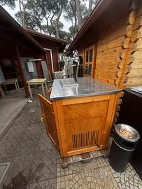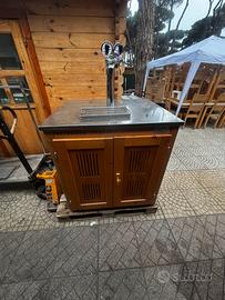 Nell'immagine è ritratto un impianto di spillatura birra professionale Si tratta di un banco in legno con un piano di lavoro in acciaio inossidabile. È dotato di una colonna di spillatura a una o due vie con rubinetti. Include una vaschetta raccogligocce in acciaio posizionata alla base della colonna. L'intero sistema è progettato per ospitare fusti di birra e un sistema di refrigerazione interno per mantenere la bevanda fredda fino al momento del servizio.