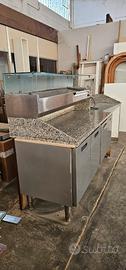 Banco preparazione pizza dim cm 310x80x95/158 h Cella frigo con n.03 sportelli e motore incorporato. Top in granito sardo cm 3 Vetrina espositiva per condimenti refrigerata.