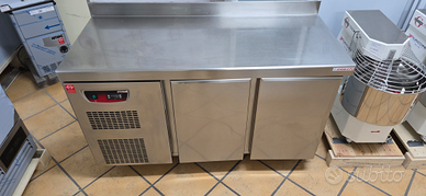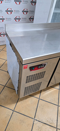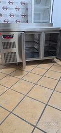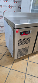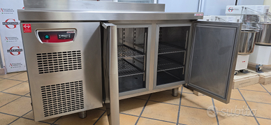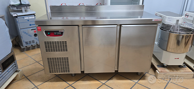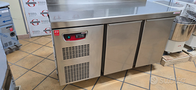 TAVOLO REFRIGERATO/banco frigo in acciaio inox 2 PORTE + vano motore ed alzatina, dimensioni cm 140x60x85h, griglie interne regolabili, termostato elettronico, marca ANGELO PO.
