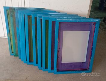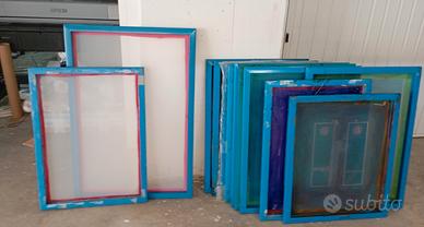 Torchio manuale serigrafico con 24 telai misure miste dal 50x70 al 67x97+ 2 racle nuove e varie cianfrusaglie