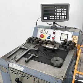 Il tornio COMEC TGA 180N è costruito in italia, macchina robusta con basamento in ghisa pesante, completa di visualizzatore di quote su 2 assi nouvo, torretta porta utensili registrabile in altezza, mandrino autocentrante Ø 200 mm a 3+3 griffe, contropunta rotante, lunetta fissa e mobile e chiavi di servizio. Macchina controllata e ripristinata dove necessario in tutte le sue funzioni per garantire la massima precisione di lavorazione. Adeguata alle vigenti normative in materia di sicurezza. A corredo della macchina, sarà fornita tutta la documentazione necessaria (Attestazione di conformità secondo normative vigenti in materia di sicurezza e manuale d'installazione, uso e manutenzione). Caratteristiche tecniche del tornio COMEC TGA 180 N Altezza punte sul banco: 180 mm Diametro massimo tornibile sul banco: 360 mm Diametro massimo tornibile sul carro: 180 mm Distanza tra le punte: 1000 mm Attacco mandrino: CAMLOCK Diametro passaggio barra: 48 mm Diametro autocentrante: 200 mm Gamma velocità 12: 50 a 1800 giri/min Corsa slitta trasversale: 180 mm Corsa slitta portautensili: 210 mm Attacco contropunta: CM4 Corsa canotto contropunta: 90 mm Diametro canotto: 55 mm Avanzamento longitudinale: 0.050 ÷ 0.700 mm/giro Avanzamento trasversale: 0.033 ÷ 0.480 mm/giro Filettature Metriche: 0.5 ÷ 7 mm Filettature Whitworth: 4 ÷ 56 Filettature Modulari: Mod. da 0.5 a 3.5 Filetature D.Pitch: 8 ÷ 112 Potenza motore: 3 kW Tensione alimentazione: 400 V 50 Hz Dimensioni: 2150 x 900 x 1600 h mm Peso: 1200 Kg Molto altro su www.bsmacchine.it come trapano, fresa, tornio, rettificatrice, centro di lavoro CNC, sabbiatrice, sega a nastro, pressa, vasca di lavaggio ultrasuoni SOGI.