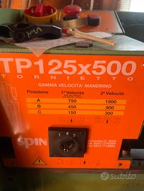Vendo tornio Spin 125X500 la macchina è stata usato pochissimo distanza da mandrino a contropunta 500mm distanza da centro mandrino a slitta110 mm dimensioni esterne lunghezza un metro e 20 larghezza 45 cm altezza un metro 20 il tornio ha il suo mobiletto di sostegno e lo sportello vano oggetti presenta una cerniera rotta ma riparabile