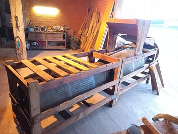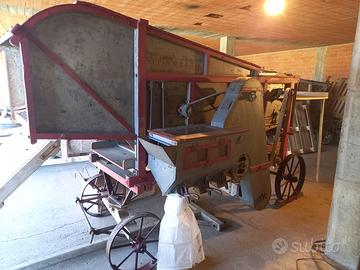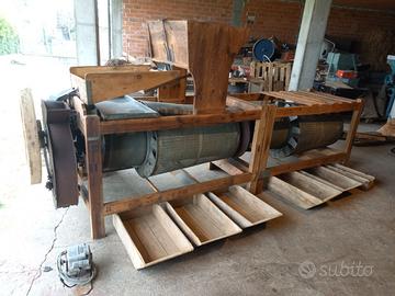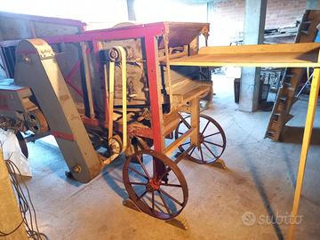 Piccola trebbia da montagna per frumento e legumi con doppia ventilazione, completa di accessori, cinghie vagli. Dimensioni macchina cm 300x160x190 Disponibile anche lo svecciatoio con ventilazione in foto.