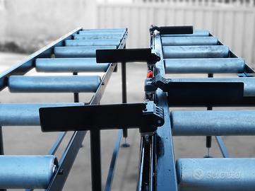 - rulliere su misura robuste, precise e regolabili, perfettamente integrabili alla troncatrice e il suo banco, con piedini fissabili a terra, con lunghezze di 5m (rulliera in ingresso semilavorati) e 4m (rulliera in uscita dei segati), quest'ultima dotata di 4 fermi di taglio liberamente posizionabili a seconda della produzione richiesta. Le rulliere possono essere dotate di nastro metrico adesivo una volta montate nel laboratorio di taglio al dine di garantire un taglio veloce e preciso.