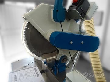 Troncatrice orientabile di precisione OMGA T50 350 CE in perfette condizioni. Dotata di tavola rotante e bloccaggio autocentrante per le angolazioni principali 90-45-30-22,30-15-10 gradi destra e sinistra, bloccaggio manuale per tutte le altre angolazioni intermedie, con lettura sul settore graduato. La struttura in ghisa, il motore di 2,2 kW con alimentazione trifase, la trasmissione a cinghia e la lama diam. 350 mm., garantiscono una robustezza assoluta e un'importante capacità di taglio.
