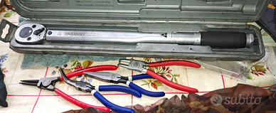 Vendo per inutilizzo utensili vari nuovi acquistati tempo fa quando avevo la moto chiave dinamometrica teng tools attacco da 1/2 coppia di serraggio 40-200 2 pinze da seger una che apre kinps una che chiude nws a punte storte 2 pinze normali marchio Williams usa una a punte storte e una punte dritte vendo tutto assieme a 100