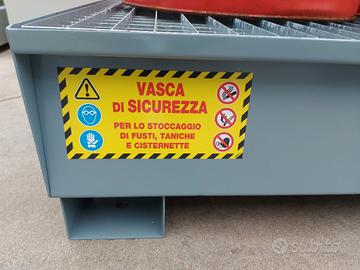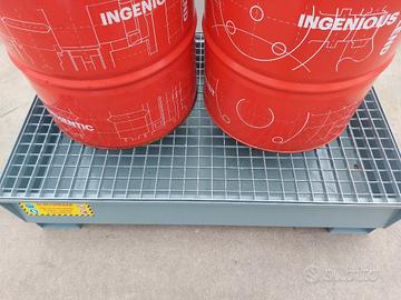 Vasca conica in acciaio verniciato a tenuta stagna , idonea per lo stoccaggio e la movimentazione di fusti da 200 lt. o IBC da 1000 lt., completa di griglia zincata estraibile, staffe per sostegno e sollevamento tramite carrello elevatore e transpallet.