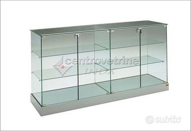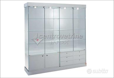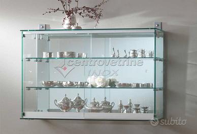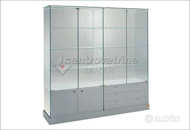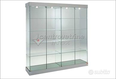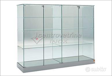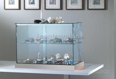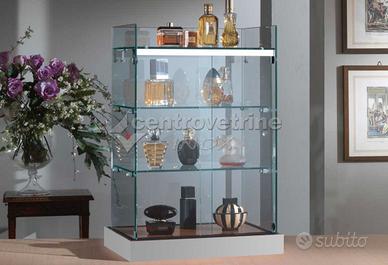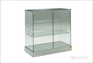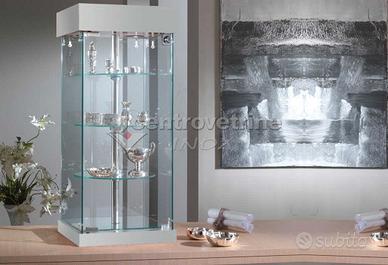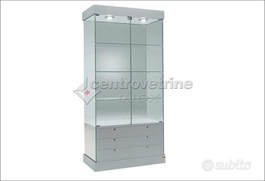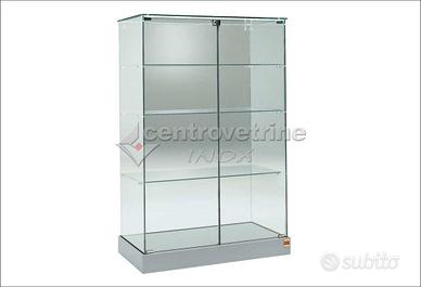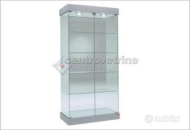 Vetrinetta espositiva, serie LAMINATO 130/CC, con vetri in cristallo temperato, n.2 ante battenti con serratura, n.4 ripiani e base con ruote a scomparsa. PESO: 95 kg