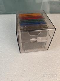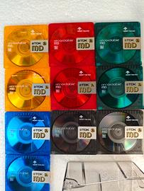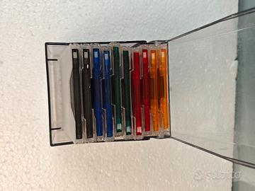 10 Minidisc colorati con custodia singola e raccoglitore trasparente per 10 minidisc.