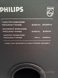 2 Diffusori Philips anni 90 da cm 60x26,5x25 e altre caratteristiche come da foto. Esteticamente perfetti. I woofer sono nuovi e funzionanti, I tweeters e i midrange invece non suonano. Credo che il problema stia nei filtri e che uno che se ne intende possa risolverlo facilmente.