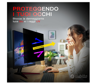 Vendo 2 pellicole privacy per monitor da 22 pollici 16:10 , filtro luce blu protez 180 gradi. Nuovo con scatola e accessori. Le pellicole sono abbastanza spesse e belle resistenti hanno il filtro privacy a 180 che non ne abbassa la luminosità, ma di lato non si vede niente come le pellicole per smartphone. Hanno il filtro antiriflesso e il filtro per la luce blu rimovibili facilmente. Le dimensioni esatte sono 47.4 cm per 29.6 cm . Volendo possono essere tagliate e adattate a display o monitor più piccoli , basta fare un lavoro di precisione. Materiale pet e rigidità 3h. Si consiglia sempre di montarli su monitor con le giuste dimensioni . Basta misurare il lato e l'altezza sopra riportate . Mantiene comunque un ottima visibilità frontale ma di lato non si vede nulla. Ottimo per la privacy in tutti gli ambienti . Kit d'installazione compreso con giuda per l'installazione che è comunque abbastanza semplice . Prodotto di ottima fattura e qualità, il quale limita anche le luci blu dannose per gli occhi. Con queste pellicole anche dopo usi intesi gli occhi si affaticano molto meno e non si hanno danni a lungo termine , soprattutto per chi ci lavora , studia o utilizza i PC o monitor per molte ore al giorno .