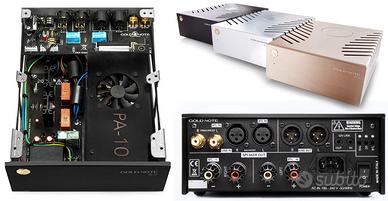 Coppia di finali pari al nuovo. Disponibile anche un Gold Note DS-10. Compatto e potente: l’amplificatore dalle performance eccezionali PA-10 è un amplificatore finale di grande potenza, dalle dimensioni compatte ed estremamente versatile, adatto a qualsiasi moderno sistema audio High-End, con la possibilità di essere utilizzato sia in modalità Stereo che Mono. L’estetica del telaio deriva dagli altri prodotti della Serie 10, integrando il PA-10 in un concetto coerente ed ispirato allo stile italiano e al design modulare Gold Note. Il telaio è realizzato con pannelli in alluminio pesante e componenti audio accuratamente selezionati. La tecnologia proprietaria sviluppata per PA-10 lo rende paragonabile ad un amplificatore di classe A, raddoppiando la sua potenza e riducendo l’impedenza dei diffusori. È dotato di 75W @ 8Ω, 150W @ 4Ω e 300W @ 2Ω in modalità stereo e un sorprendente 300W @ 8Ω e 600W @ 4Ω in modalità mono. Il PA-10 si distingue per la sua grande versatilità: grazie al fattore di smorzamento regolabile e alla funzione BTL (Bridge-Tied-Load) si abbina perfettamente a qualsiasi tipo di diffusore, sia di grandi dimensioni e difficili da pilotare (DF High) che ad alta sensibilità o mini-monitor (DF Low). L’uscita stereo XLR consente di configurare il PA-10 in serie, per soluzioni multi-room di alta qualità, facilitate dalla modalità On/Standby automatica basata sul segnale audio ricevuto. Il PA-10 è dotato di ingressi RCA e XLR ed offre opzionalmente la possibilità di essere collegato contemporaneamente a due sorgenti diverse. Facile da usare grazie alla tecnologia GN Link che permette di utilizzare due o più amplificatori in modalità master-slave con altre unità che presentano la stessa caratteristica (accende/spegne tutte le unità collegate tramite GN Link).