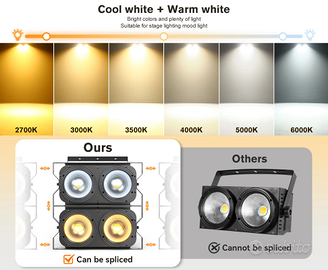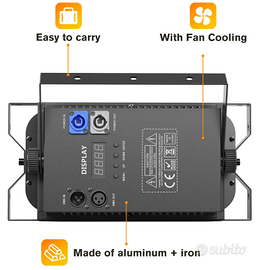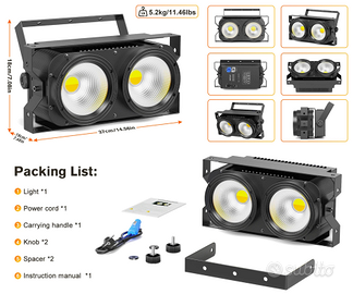 Blinder Lights U'King 200W LED 2IN1 COB DMX Cool & Warm White 2 Eyes LED. 2 PEZZI (2pz) Oggetto nuovo (sigillato) compreso di tutta la dotazione Vendo per mancato utilizzo. Specifications: Color: black Material: aluminum + iron Voltage: AC90-220V, 50-60Hz Light source: 2 PCS white + warm white leds Channel: 8 CH Control mode: Sound-activated, master-slave, self-propelled, DMX512.