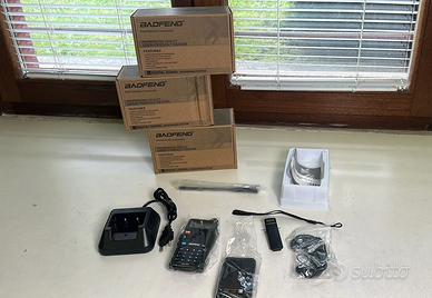Set di 3 ricetrasmittenti Baofeng UV-5R walkie talkie complete di accessori, ideali per comunicazioni a lunga distanza senza bisogno di rete telefonica. Perfette per escursioni, lavoro, sicurezza, softair, campeggio, cantieri e uso professionale. Le radio Baofeng UV-5R sono Dual Band, potenti e affidabili, con audio chiaro e lunga autonomia grazie alle batterie Li-ion incluse. 📦 Contenuto della confezione (set completo): ✅ 3 Ricetrasmittenti Baofeng UV-5R ✅ 3 Auricolari ✅ 3 Batterie Li-ion ricaricabili ✅ 3 Antenne Dual Band ✅ 3 Caricatori da scrivania ✅ 3 Trasformatori di alimentazione ✅ 3 Clip da cintura ✅ 3 Cordini da trasporto
