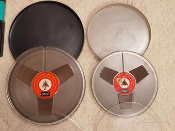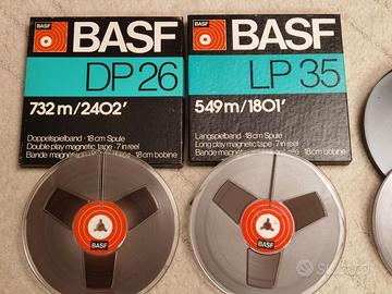 4 bobine audio BASF: 2x DP26 LH 18 cm 730 m (120 min per traccia @ 9,5 cm/s) 1x LP35 18 cm 540 m (90 min per traccia @ 9,5 cm/s) 1x LP35 15 cm 360m (60 min per traccia @ 9,5 cm/s) Nastri registrati una volta (da cancellare).