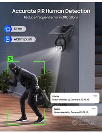 【3MP HD & Visione Notturna a Colori】Telecamera con 3MP HD e ha incorporato 2 x LED IR e 4 x luci LED bianche. Quando un oggetto attiva il rilevamento del movimento, la telecamera registra automaticamente un video a colori e lo salva sulla scheda di memoria.