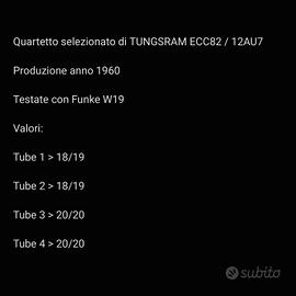 Quartetto di valvole NOS TUNGSRAM ECC82 / 12AU7, produzione anno 1960, perfette e testate con Funke W19 da professionista coi seguenti valori: Tube 1 > 18/19 Tube 2 > 18/19 Tube 3 > 20/20 Tube 4 > 20/20 Priorità vendita come quartetto a 239€. Possibità di vendita una coppia per 140€. Spedizione possibile con imballo ben protetto in tutta Italia a partire da 8€. In tutta Europa a partire da 19€. SOLO persone seriamente interessate. NON scambio con nulla. Utilizzabile e compatibile con tutte le seguenti elettroniche Hi-Fi: audio,research,mcintosh,accuphase,dcs,electrocompaniet,marantz,cardas,audioquest,b&w,sonus,faber,rocal,van,den,hul,wilson,oass,magico,naim,rega,musical,fidelity,acoustic,energy,auralic,chord,denon,pioneer,dynaudio,chario,furutech,gold,note,the,gryphon,harbeth,hegel,klipsch,mark,levinson,meridian,monitor,etc Le foto fanno parte della descrizione. Il prezzo del prodotto tiene conto delle condizioni reali e delle misure specialistiche. In quanto vendita tra privati si esclude qualsiasi forma di garanzia Si esclude, in caso di spedizione, qualsiasi responsabilità in caso di smarrimento, danneggiamento o altro da parte del corriere
