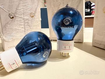 Propongo tre coppie di splendidi tubi 6SN7 blu balloon PSVANE selezionati ed accoppiati direttamente in fabbrica ed uscite dalla scatola solo per essere fotografate. Valvole di ultimissima tecnologia con zoccolo in ceramica, piedini dorati, sound veramente di altissimo livello, microfonicità zero, ideale upgrade delle vecchie 6SN7 classiche (GT, GTA o GTB che siano) sia su ampli che su preamplificatori. In pratica si tratta di una 6SN7 GTB (la più potente oltre che la più recente) con le placche un pochino più grandi e il vetro balloon. Il suono molto analitico resta sempre estremamente musicale, ed è questo l'aspetto che più stupisce chi le ascolta per la prima volta! Questo è il set ideale per coloro che non vogliono farsi rapinare con i cosiddetti tubi NOS, roba di 40-50 anni fa che viene spacciata per “nuova” ma che in realtà non si sa mai quanto sia stata usata e da chi, conservata in maniera improbabile e che comunque del vuoto integrale conserva solo il ricordo. Vendo ogni coppia a 50 euro assolutamente intrattabili, auspicabile lo scambio a mano a Roma. Posso spedire a vostre spese ma solo a fronte di bonifico anticipato, insomma NON SPEDISCO CON TUTTOSUBITO.