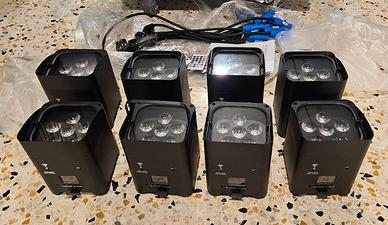 Set di 8 fari Led Par a batteria Wisdom Smart Bat (neri) con baule rinforzato completo di ruote per il trasporto, inclusi cavi di ricarica (NUOVI)