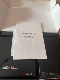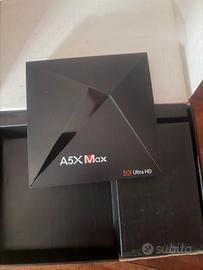 Vendo android TV Box A5X Max+ per IPTV e rendere smart la tv installando qualsiasi app da Google Play Store. Caratteristiche: CPU quad core 64bit: RK3328 RAM 4GB ROM 64GB Wifi: 2.4/5 GHz Versione android: 8.1 Uscita video: 4K