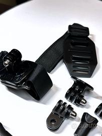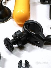 Gruppo di numerosi accessori e supporti per action cam universali, ideali per GoPro e compatibili.