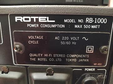 Vendo finale di potenza Rotel RB1000 + preamplificatore Carver C2 in perfetto stato funzionale. Segni dovuti all'età degli oggetti. Vendo in coppia a €430 più spedizione accurata oppure singolarmente : Finale Rotel RB1000 (Made in Japan ) €220. Pre Carver C2 (Made in Usa) €280. Si vendono nella forma visto e piaciuto senza garanzia e possibilità di reso. Imballo accurato a prova di corriere maldestro.