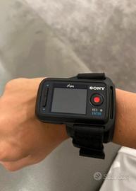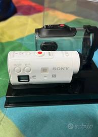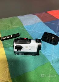 Videocamera della Sony con custodia impermeabile e gadget per poterla attaccare a delle superfici con un biadesivo.