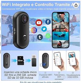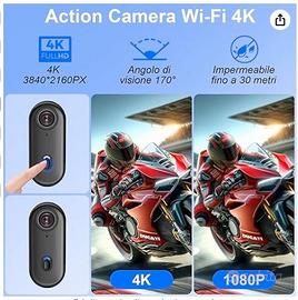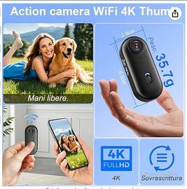 Action Cam 4K e 170° Delle Dimensioni di un Pollice. Questa action cam 4K con tracciamento audio-video pesa solo 35,7g (6.45x2.8x2 cm) — più piccola di un pollice, ma offre video 4K e grandangolo da 170°. Ideale per sci, escursionismo o uso quotidiano. Leggera e portatile, si fissa facilmente a caschi, bici o zaini. Perfetta per sport outdoor, vlogging e riprese quotidiane 📲 Controllo Via APP e Streaming Live. Collegala via Wi-Fi e controlla completamente questa action cam indossabile con l’app "Viidure" (portata 10 m, compatibile con iOS e Android). Controllo wireless: anteprima in tempo reale, riproduzione immediata e download diretto sullo smartphone. Condividi i momenti salienti in live o salva i video nel cloud. Ideale per creator di contenuti e appassionati di social media 🌊 Action Camera Impermeabile 30 Metri. Robusta e resistente all’acqua fino a 30 metri, questa action camera subacquea 4K WiFi offre prestazioni eccellenti anche in surfing, ciclismo o pioggia intensa. Progettata per avventurieri che necessitano di una telecamera affidabile in ambienti difficili. Include custodia impermeabile e kit di montaggio versatile per molteplici scenari 🧲 Montaggio Ovunque. Questa mini body cam include molti accessori per posizionarla ovunque: fissala a superfici metalliche (bici, porte) con la clip magnetica come chest cam; usala con il girapanoramica 360° e la custodia impermeabile come helmet cam o skate cam; o avvolgila su braccio, albero o collare di animali con il cinturino in silicone. Riprese hands‑free senza strumenti aggiuntivi 🔋 Batteria Integrata da 800 mAh a Lunga Durata. Fino a 120 minuti di registrazione continua, ideale per escursionismo, ciclismo o varie attività. Funziona come vlog camera, body cam, pet cam, bike cam, helmet cam e dashcam. Supporta la registrazione durante la ricarica, per non perdere nessun momento prezioso NO OFFERTE PREZZO NON TRATTABILE è NUOVA MAI USATA