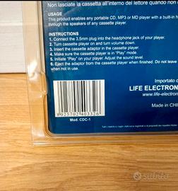 Riproduce qualsiasi lettore CD , MP3 e Mini Disc attraverso un lettore di audiocassette.