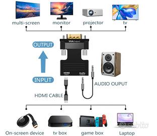 -- Condivide file video/audio/dati da nuovi PC con sola presa HDMI a qualsiasi dispositivo con porta VGA (RGB) come TV, monitor, proiettori etc.