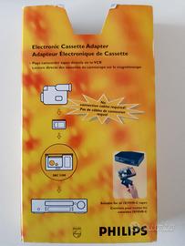 Adattatore per cassette elettronico della PHILIPS a caricamento automatico, adatto per cassette compatte VHS C della cinepresa (cm 6 x 9), di facile utilizzo, senza utilizzo di cavi, non danneggia il nastro, consente di riprodurre e di registrare, perfettamente funzionante, necessita di una pila da 1,5 V. Vendo per inutilizzo a 25 €.