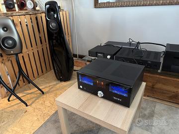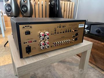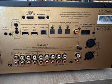 vendiamo come da titolo amplificatore integrato stereo IBRIDO marca ADVANCE PARIS modello A10 CLASSIC , pari al nuovo completo di accessori e imballi originali RICHIESTA 1050,00 euro visibile presso il nostro punto vendita di via capitano alessio 110 36027 rosà (Vi) cell negozio 042485330 digitex audiovideo www.audiostoreservice.it Specifiche tecniche • Amplificatore ibrido con preamplificazione a valvole (2x ECC81/12AT7) e finale a stato solido • Potenza: 130 Watt per canale su 8 Ohm, 190 Watt su 4 Ohm in Classe AB • Commutatore high bias per funzionamento analogo alla Classe A • DAC AKM AK4490 a 32 bit/768 kHz con supporto DSD fino a 11.2 MHz e PCM fino a 32 bit/384 kHz • Stadio di alimentazione con trasformatore toroidale sovradimensionato e 4 condensa-tori di filtro da 6800 uF/71 V • Stadio Phono MM con regolazione della capacità • 2 porte HDMI (di cui 1 con ARC) • Porta USB Type A per riproduzione da Pen Drive (FAT32/128 GB) • Supporto per modulo Bluetooth 5.0 opzionale (X-FTB2 o X-FT01) • Ingressi digitali: 2 HDMI, 1 USB Type B (XMOS asincrono), 1 coassiale RCA, 3 ottici Toslink • Ingressi analogici: 1 bilanciato XLR, 5 sbilanciati RCA, 1 Phono MM • 2 uscite RCA per subwoofer • Uscita REC Out L/R e separazione pre/finale con connettori “Amp In” e “Pre Out” • Amplificatore per cuffie con jack 6,3 mm • Doppi terminali per diffusori (A/B/A+B) • Doppia porta Trigger Out • Display alfanumerico e VU-Meter analogici • Dimensioni: 430 x 175 x 385 mm (L x A x P) • Peso: 14,5 Kg