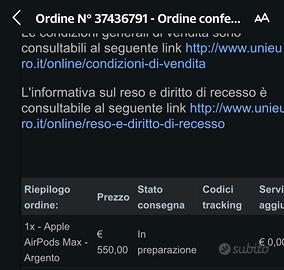 Dichiaro che il Prodotto è originale venduto da unieuro e dati delle AirPods