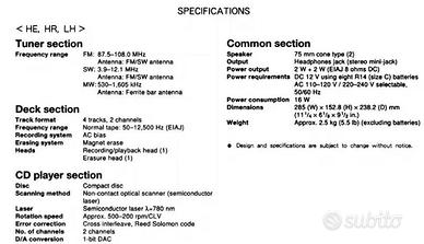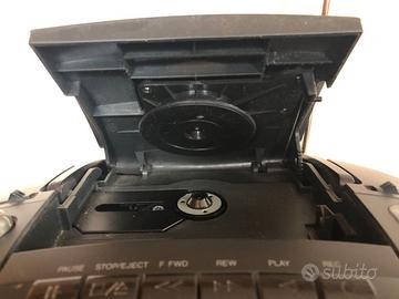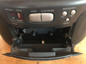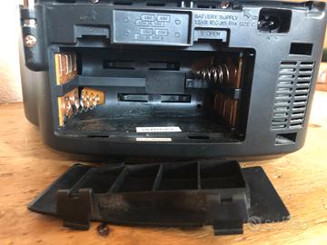 La radio è la parte che funziona meglio di tutte, non da grossi problemi, però si sente che le casse sono un po' ballerine, a volte si depotenziano per così dire e il volume si abbassa. Il problema si nota di più durante la riproduzione dei nastri, per qualche motivo, che a parte questo, funziona bene. Il lettore cd invece sembra inaffidabile, fatica a funzionare. In sostanza l'apparecchio non è perfetto, andrebbe riparato. Vendo pertanto l'oggetto come non funzionante, per parti di ricambio, anche se magari basta solamente una messa a punto. La cassettina è per parametro dimensioni. Vano batterie non testato ma sembra in ottime condizioni.