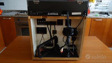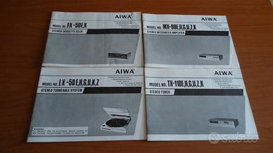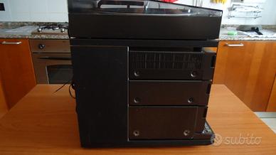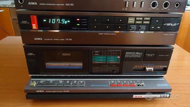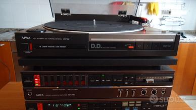Vendo impianto stereo Aiwa a componenti separati composto da LX-50,giradischi tangenziale a trazione diretta,testina e stilo Audiotechnica;MX-90,amplificatore integrato con equalizzatore a 7 bande,potenza 30 watt per canale;TX-110,sintonizzatore AM-FM;FX-50,piastra a cassette con Dolby B-C e ricerca brano;RK-X9,mobile per alloggiare e collegare i componenti.Completo dei manuali originali.Tutto in ottimo stato e perfettamente funzionante.Dimensioni del rack cm.33x37x39,peso complessivo circa kg.20.