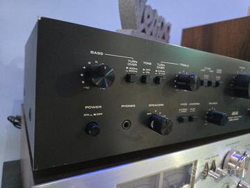 AMPLIFICATORE DALLE DELIZIOSE SONORITÀ FRUTTO DI UNA QUALITÀ COSTRUTTIVA TIPICA DELLE MACCHONE DEGLI ANNI D'ORO DELL'HI-FI. CONDIZIONI PARI AL NUOVO, PERFETTAMENTE REVISIONATA. Potenza di uscita: 40 watt per canale su 8Ω (stereo) Risposta in frequenza: da 20 Hz a 20 kHz Distorsione armonica totale: 0,15% Fattore di smorzamento: 60 Sensibilità di ingresso: 3 mV (MM), 150 mV (DIN), 150 mV (linea) Rapporto segnale/rumore: 75 dB (MM), 95 dB (linea) Separazione dei canali: 55 dB (MM) Uscita: 150 mV (linea), 30 mV (DIN) Impedenza di carico dell'altoparlante: da 4Ω a 16Ω Semiconduttori: 33 transistor, 15 diodi Dimensioni: 440 x 141 x 331 mm Peso: 9,1 kg