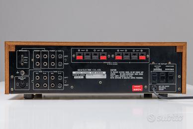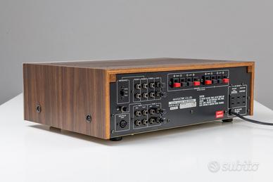 Modello storico, solido e pesante, con VU-meter illuminati, controlli toni separati (bassi, medi, alti) e un suono caldo tipico dell’hi-fi giapponese dell’epoca.