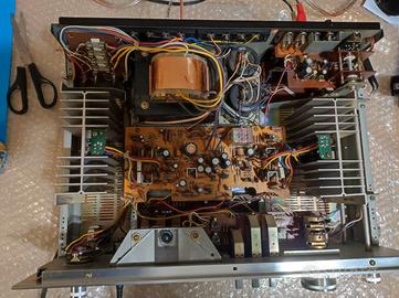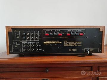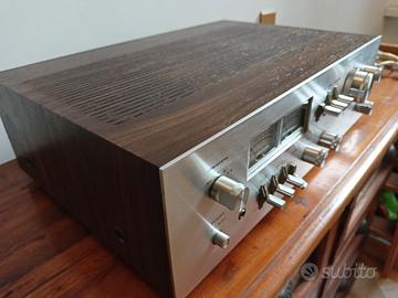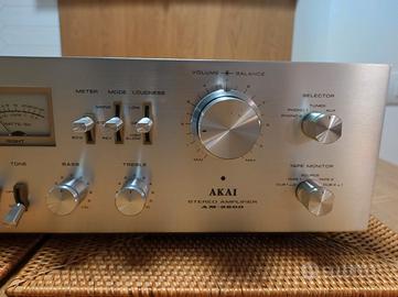 Vendo splendido amplificatore stereo integrato Akai AM-2600, prodotto in Giappone tra il 1976 e il 1979. Un classico dell'Hi-Fi vintage della golden age giapponese, con i suoi iconici VU meter illuminati e il caratteristico cabinet in legno originale. Caratteristiche principali 60 Watt per canale su 8Ω 2 ingressi Phono (MM) + Tuner + Aux + 2 Tape con dubbing Filtri passa-alto e passa-basso selezionabili su due frequenze Loudness a due livelli Tone Defeat per bypass dei controlli di tono Uscite per 2 coppie di diffusori (A/B) + cuffia Costruzione full metal con finitura silver e pannello frontale in alluminio spazzolato Cabinet in legno originale in ottime condizioni Specifiche tecniche Risposta in frequenza: 20Hz – 20kHz Distorsione armonica totale: 0,1% Rapporto S/N: 75dB (phono), 95dB (linea) Fattore di smorzamento: 60 Dimensioni: 440 × 141 × 331 mm Peso: 10 kg Condizioni L'amplificatore è perfettamente funzionante. Il suono è caldo, dettagliato e potente come ci si aspetta da un integrato giapponese di quest'epoca. la manopola del volume riporta qualche piccolo graffio. All'interno del cabinet in legno è ancora visibile il timbro di fabbrica originale giapponese (hanko dell'ispettore di qualità) — un dettaglio che testimonia l'autenticità e la cura artigianale della produzione Akai dell'epoca.