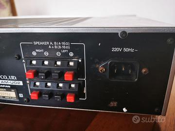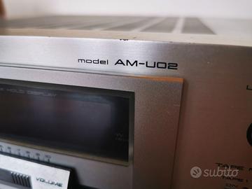 Funziona perfettamente!! AM-U02- Per appassionati di strumentazione vintage. È disponibile anche un filmato! Posso spedire con corriere per un costo da aggiungere di 15 €. Non sono disponibili i cavi di collegamento agli apparecchi HI-FI. Qualche invitabile segno Per i più tecnici: Potenza di uscita: 26 watt per canale su 8Ω (stereo) Risposta in frequenza: da 10Hz a 40kHz Distorsione armonica totale: 0,01% Fattore di smorzamento: 45 Sensibilità di ingresso: 3 mV (MM), 150 mV (DIN), 150 mV (linea) Rapporto segnale-rumore: 75dB (MM), 95dB (linea) Separazione dei canali: 55dB (MM) Uscita: 150 mV (linea), 30 mV (DIN), 1 V (pre out) Impedenza di carico dell'altoparlante: da 4 Ω a 16 Ω Semiconduttori: 16 x transistor, 19 x diodi, 9 x IC Dimensioni: 440 x 105 x 300 mm Peso: 7,8 kg
