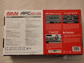 Perfettamente funzionante, MIDI USB Controller compatto per Ableton Live dotato di 40 pad retroilluminati per la gestione delle Clip nella finestra Session, una tastiera 25 tasti mini sensibile alla dinamica e 8 potenziometri rotativi a 360°.