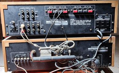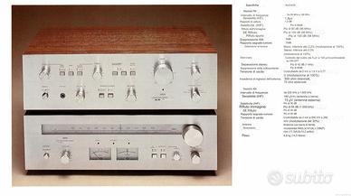 AKAI AT-2400 amplificatore + sintonizzatore + 2 casse •Produttore del modello: Akai •Informazioni basilari Modello: AT-2400 •Tipo: Tuner •Anni di costruzione: 1977 - 1979 •Prodotto in: Giappone •Colore: Argento o Nero •Dimensioni (W/H/T): 440 x 141 x 336 mm •Peso totale: 6,6 kg •Nuovo prezzo circa 648 DM Le connessioni •Numero di uscite: 2 oCorrezione di linea: 0.75 V, 1 kOhm oLinea variabile: 0 - 1 V •Numero di ingressi: oAntenna Impedenza FM: 75 Ohm coassiale, sbilanciato 300 Ohm Equilibrato Dati tecnici •La reception: •Frequenze: FM / MW oVHF: 88 - 108 MHz oMW: 522 kHz - 1620 kHz •Risposta in frequenza: 20Hz - 15kHz (+0.2 / -1.5dB) •La sensibilità di input: oVHF: 1.8-V oMW: 180 V •Il fattore di Ceach: oMono: 0,15% (1Khz) oStereo: 0,2% (1Khz) •Spartitura di corsa del segnale: oMono: 75 dB oStereo: 70 dB •Separazione del canale stereo: 45 dB •Taglio di nitidezza: 100 dB •Selezione DC: 1.0 dB •Selezione Sidewave: 80 dB •Smorzamento della frequenza dello specchio: 100 dB •ZF smorzamento: 110 dB •AM-soppressione: 55 dB Equipaggiamento speciale •FM silenziabile controllabile •Livello di uscita regolabile •Filtri di rumore