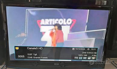 Per chi lo deve usare come monitor o non vuole il decoder il prezzo è di 30 euro. possibilità di spedizione. Monitor tv Akai 25 pollici FULL HD in ottime condizioni, perfettamente funzionante senza nessun problema, con micro decoder esterno HEVC MAIN 10 DVB/T2 Edison, unico telecomando per la gestione di tv e decoder, possibilità di registrare programmi o film su chiavetta USB frontale, possibilità di vedere film, programmi, foto ecc. da chiavetta USB, funzione informazione programmi in tv con sintesi (guida programmi in tv), timer per lo spegnimento automatico, utilissimo per chi si addormenta con la tv accesa e altro, orologio, manuale istruzioni ecc.