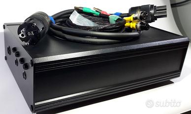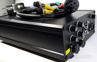 Alimentatore lineare stabilizzato (non switching) serie LINEPWS 5V 4A+12V 3A per apparecchiature audio (DAC ecc.). Questo alimentatore garantisce le massime prestazioni funzionali in ambito EMC e disturbi indotti, è quindi adatto per tutte le applicazioni critiche dove sia espressamente richiesta l'assenza di disturbi (HiFi, sicurezza, TVCC e altro). L'alimentatore è caratterizzato dalla corrente di uscita di 4A+3AA su due uscite a diversa tensione (+5V e +12V) e per l'accurata filtratura della tensione in uscita. CARATTERISTICHE TECNICHE: Tensione di ingresso: 230 Vc.a. +/- 10% - Tensioni di uscita: 5V e 12 Vc.c. +/- 5% - Corrente di uscita: 4A max. su 5V, 3A max. su 12V con segnalazioni a LED - Ripple di uscita: < 0,01% - Temperatura di esercizio: -40°C > +85°C - Raffreddamento tramite dissipazione meccanica - Protetto contro sovratensioni, sovracorrenti (limitazione di corrente), sovratemperature, cortocircuiti e sovraccarichi - Protezioni in ingresso e uscita tramite fusibile - Segnalazioni: LED presenza tensione in ingresso e in uscita - CONTENITORE E ACCESSORI: Fornito in contenitore in alluminio anodizzato e spazzolato, in alluminio nero - Accessori in dotazione: cavi di collegamento - Dimensioni 300x200x86 mm. - Peso 3,5 Kg. - POSSIBILE AVERE TENSIONI DIVERSE SU RICHIESTA - Spedizione con corriere espresso, tracciabile. ATTENZIONE! L'apparato viene costruito su commissione, considerare i necessari tempi di produzione (all'incirca 5/10 giorni lavorativi). L'acquirente verrà informato sullo stato di lavorazione via email.