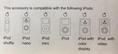 Alimentatore da auto per iPod Apple, di seguito i vari modelli: shuffle, nano, mini, Classic, iPod video, iPod con display a colori.