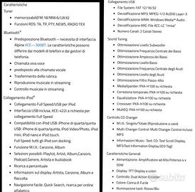 - Causa vendita auto vendo autoradio digitale Alpine, mod. iDA X100, stereo senza la meccanica CD, ideale per iPod e USB, ha tantissime funzioni, esempio 4x50watt, RDS, Imprint, controllo subwoofer, 3 RCA, 2 AUX, Display con possibilità di scaricare wallpaper, e ulteriori funzioni riportate nell' ultima foto, viene fornito di adattatore bluetooth specifico con microfono, e telecomando comprati nuovi su' Amazon, perfettamente funzionante Qualsiasi prova anche dal vostro installatore di fiducia.