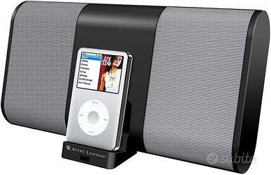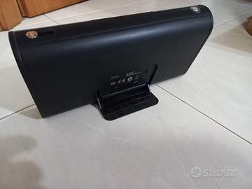 altoparlante compatto con bassi potenti per ascoltare e caricare iPod/iPhone, funzionante con batterie AA oppure con adattatore AC, collegabile con altri supporti portatili tramite ingresso ausiliario miniplug da 3,5 mm.