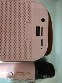 vendo bellissimo altoparlante bluetooth con il microfono, possibilità di usare per karaoke, feste, laconfezione contiene la cassa bluetooth, microfono e il cavo per la ricarica, nuovo mai usato