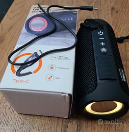 Altoparlante dalla durata batteria max 12h, bluetooth, ricarica e ingresso usb, micro sd, ingresso aux, radio, luce LED. Ottima per feste all'aperto e viaggi. Vendo per regalo non utilizzato, quindi prodotto nuovo testato solo la funzionalità per assicurare la vendita.